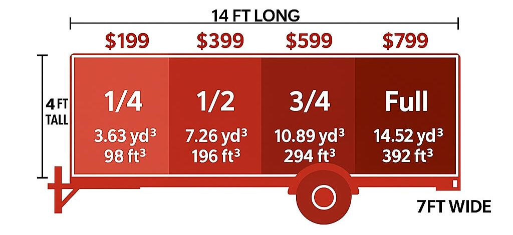 • You only pay for the space you use. Our trailer is divided into clear sections (¼, ½, ¾, or full load), and your price is based on how much of the trailer your items fill.